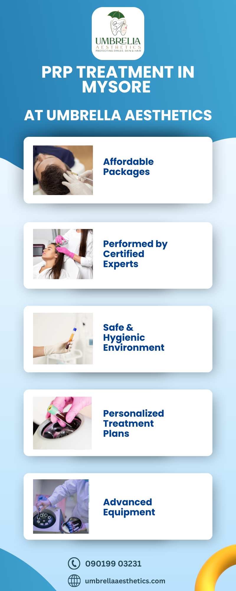 Umbrella Aesthetics is Mysore’s leading PRP provider specializing in skin and hair rejuvenation. Their technology, sterilization, and consultation process ensure a comfortable, result-driven journey.